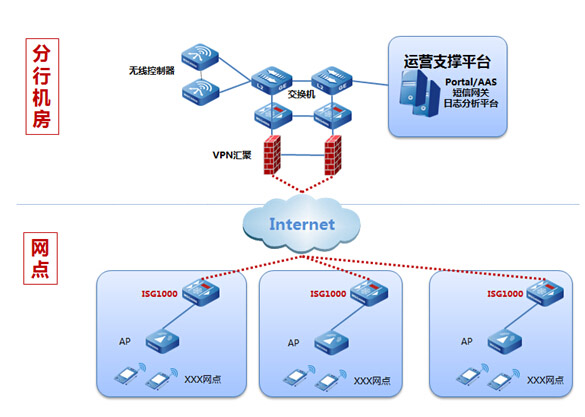 金融網(wǎng)點(diǎn)建設(shè)外網(wǎng)WLAN,為來賓用戶、網(wǎng)點(diǎn)工作人員提供便捷的互聯(lián)網(wǎng)服務(wù);